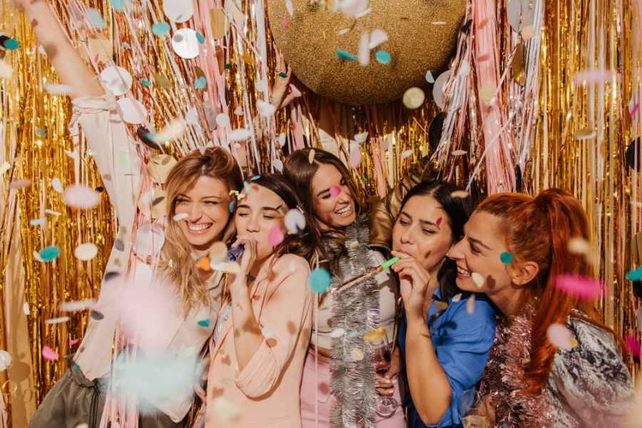 Femmes célébrant avec confettis colorés pour un réveillon minimaliste festif
